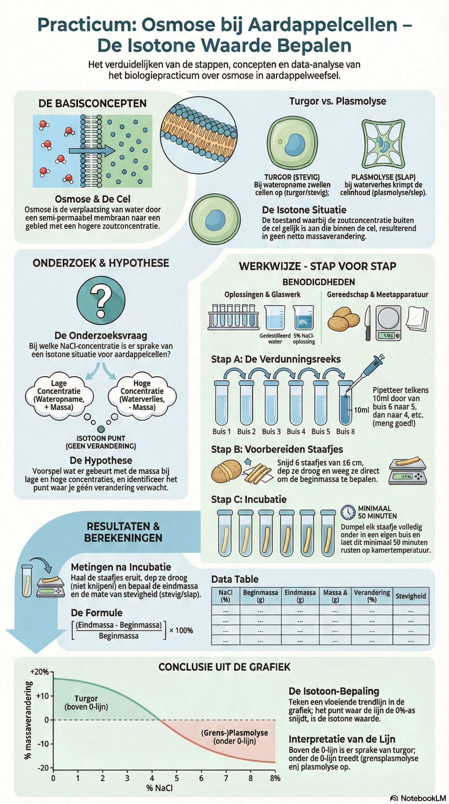Als eerste voorbeeld van praktijkgericht leren is bij hoofdstuk 4 Transport in cellen het experiment geplaatst Osmose bij verschillende NaCl-concentraties. Dit practicum is een uitstekend middel om studenten te trainen in zowel praktische vaardigheid (pipetteren, wegen), als het analytisch inzicht (rekenen, grafische interpretatie). En toont aan hoe microscopische processen in een cel (turgor, plasmolyse) direct invloed hebben op meetbare macroscopische eigenschappen zoals massa en stevigheid.